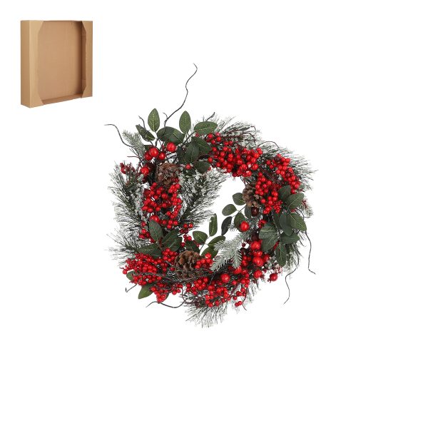 Hanging wreath Audrey, D 50,00 cm, Pine (Pinus spp.), Birch (Betula pubescens), Polyethylene, No, Green, Natural, Red mi