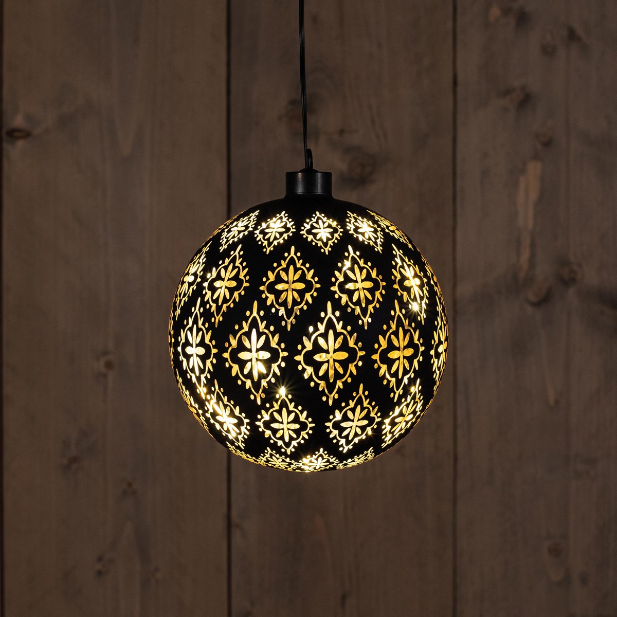 B.O. GLASS BALL BAROQUE BLACK/GOLD 15CM /12LED WARM WHITE / GOLD INSIDE / 2XAAA/50CM LEADCABLE/COLOURBOX