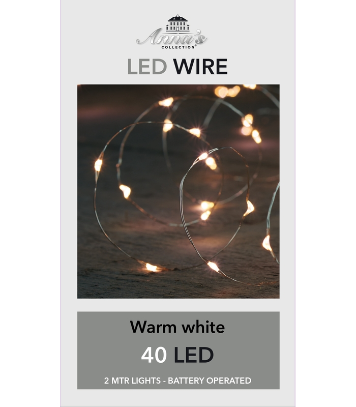 B.O. LED INDOOR SILVER WIRE 40L/2M LED WARM WHITE – 10CM LEADCABLE – B.O. 2X AA/IP20 – PET BOX