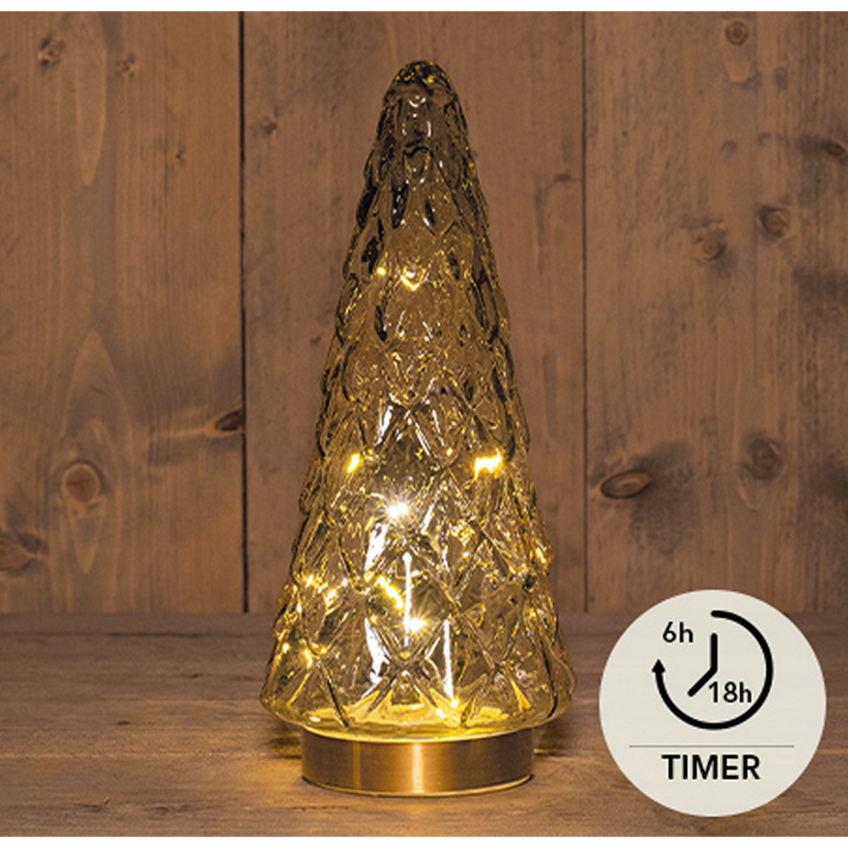 B.O.T. TREE GLASS 13X28,5CM AMBER WITH GOLDEN BASE 10LED 3XAA WITH ON/OFF/6H TIMER / STICKER AT BOTTOM