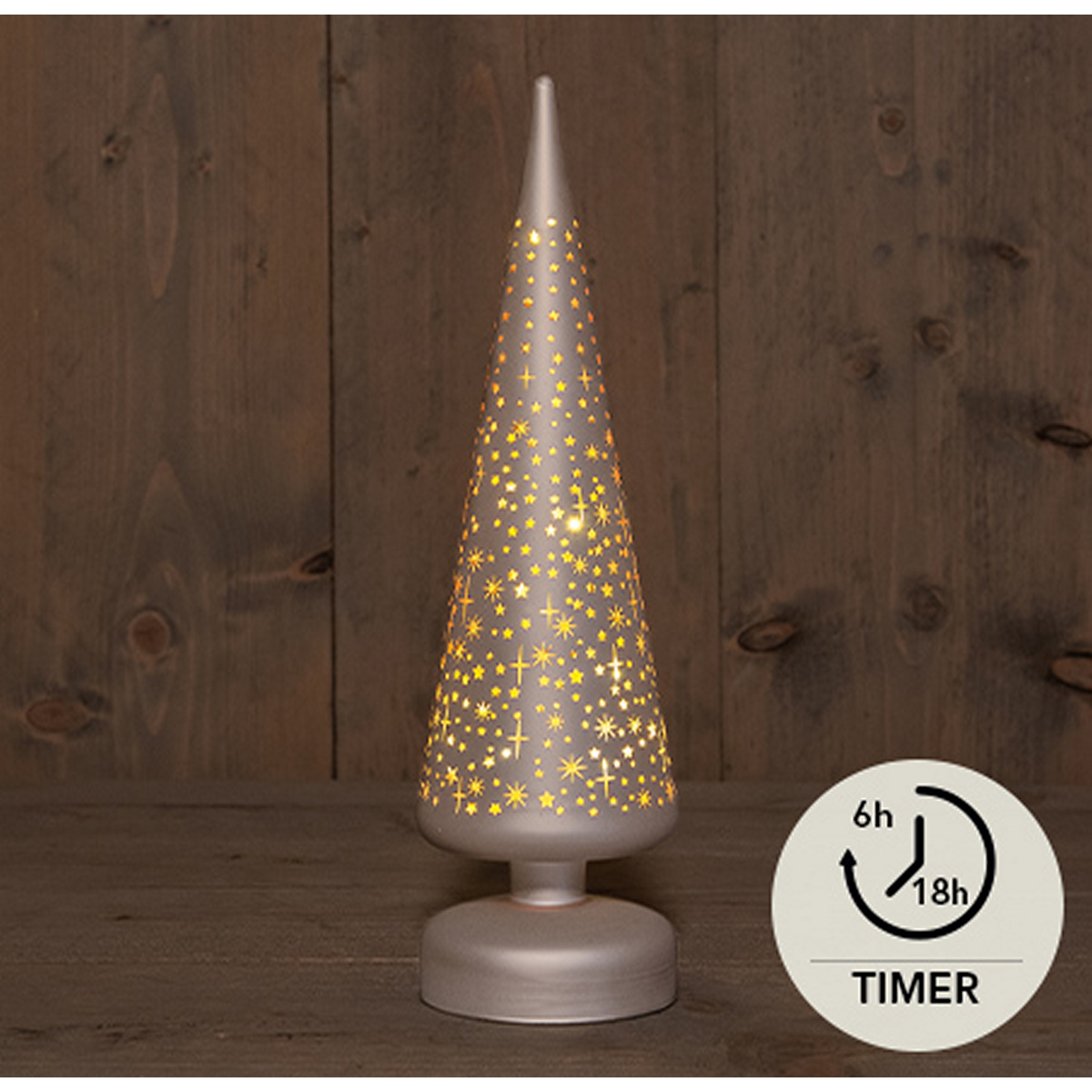 B.O.T. TREE GLASS MATT CHAMPAGNE WITH STARS 9X30CM /10LED WARM WHITE / GOLD INSIDE 3XAA ON/OFF/TIMER 6H /COLORBOX