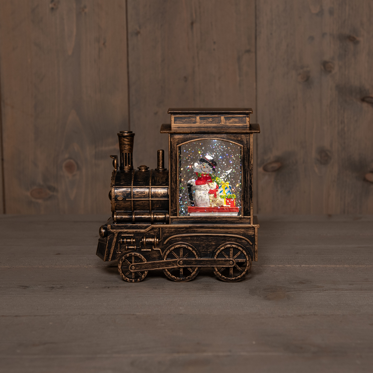 B.O. TRAIN SNOWMAN IN GLITTER WATER LED WARM WHITE/16X17CM 3XAA WITH DC SOCKET/ COLORBOX