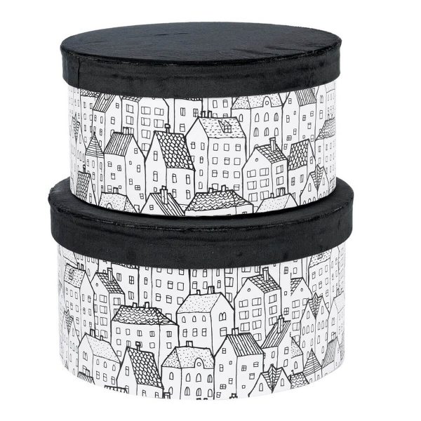 BOX Set/2 ROUND BLACK VELVET WHITE WITH HOUSESD25-Η14,5cm, D27,5-H16cm