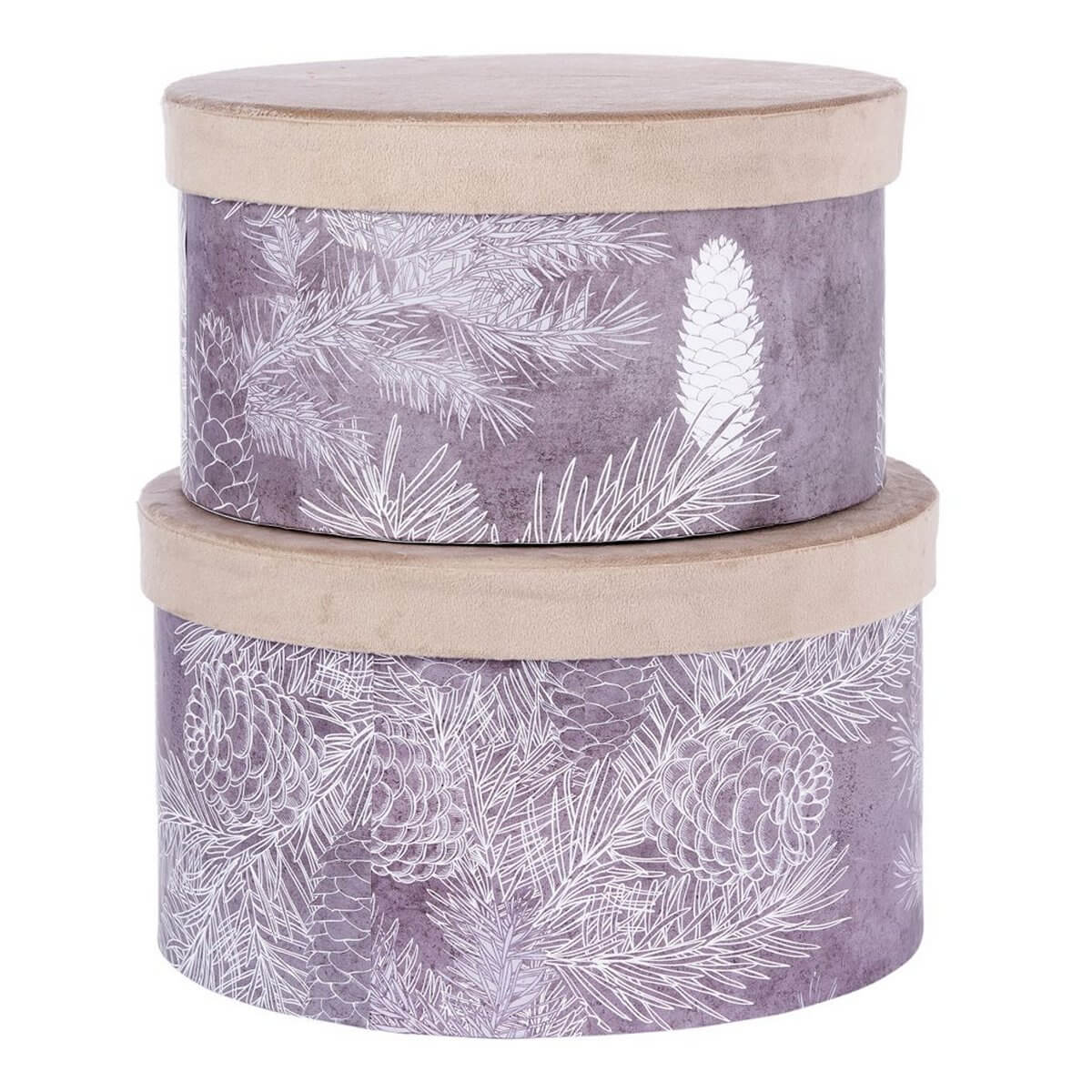 BOX Set/2 ROUND BEIGE VELVET GRAY PINES D25-Η14,5cm, D27,5-H16cm