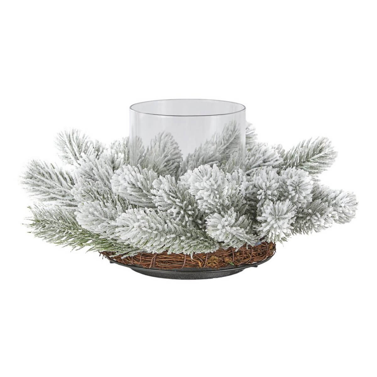 CANDLEHOLDER GLASS ON BABOO BASE WITH SNOWED PINE WREATH D:33 CM