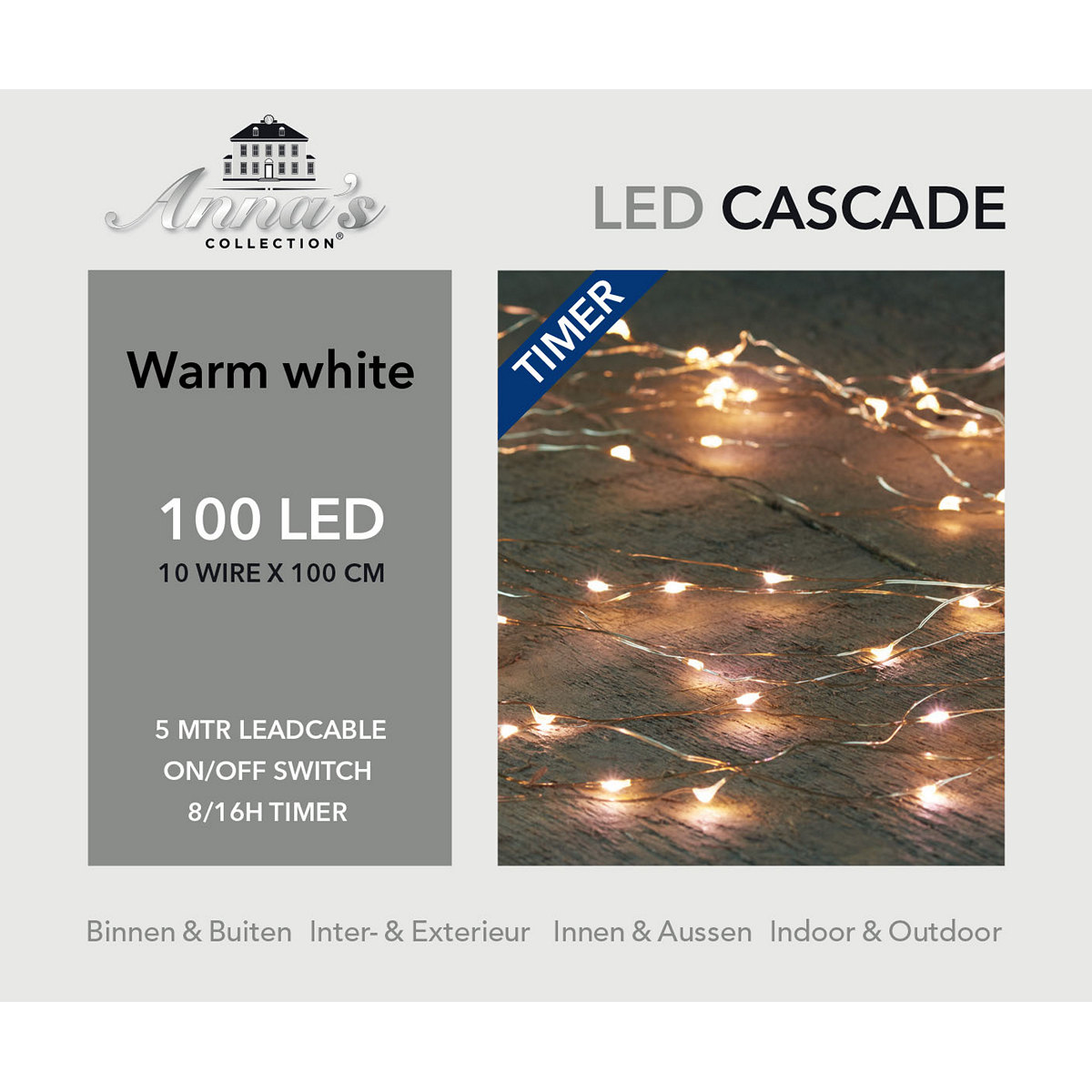 CASCADE LIGHTS SILVER WIRE 100L/10X1M LED WARM WHITE – 5M LEADCABLE TRANSPARENT – DC 3V/IP44 TRANSFORMER 3VA – COLOURBOX