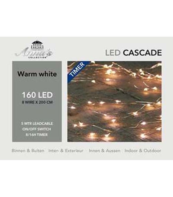 CASCADE LIGHTS SILVER WIRE 160LED/8X2MTR LED WARM WHITE – 5M LEADCABLE TRANSPARENT – DC 6V IP44 TRANSFORMER 4.8VA WITH O