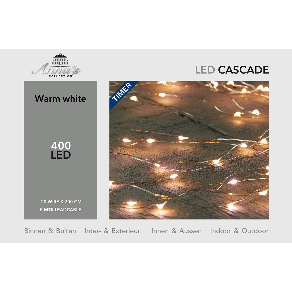 CASCADE LIGHTS SILVER WIRE 400L/20X2M LED WARM WHITE – 5M LEADCABLE TRANSPARENT – DC 6V IP44 TRANSFORMER 7.2VA – COLOURBOX