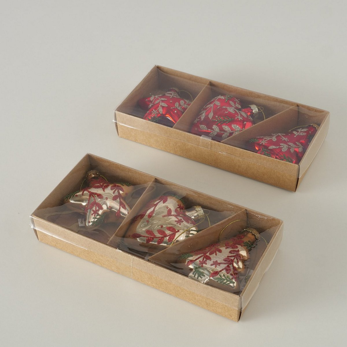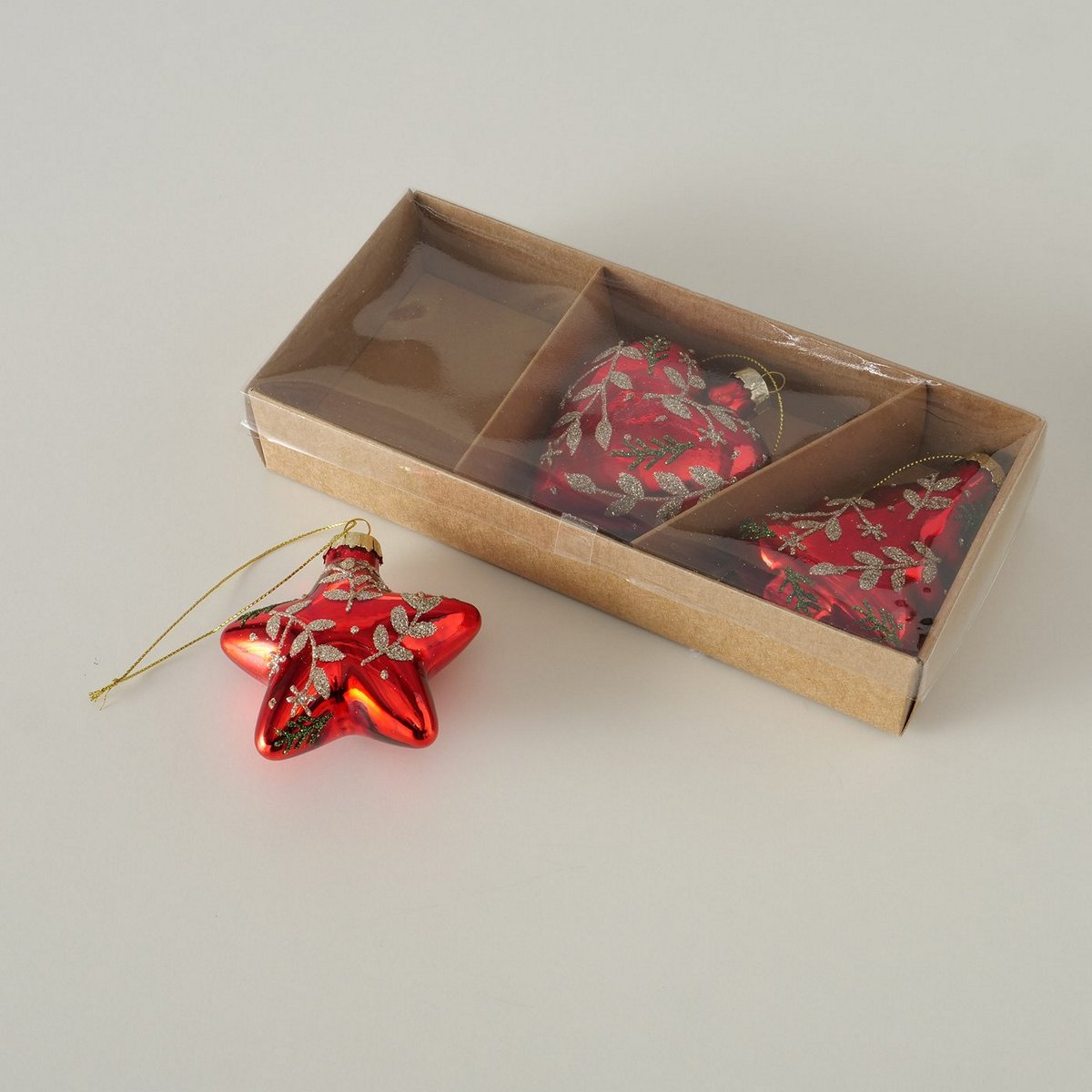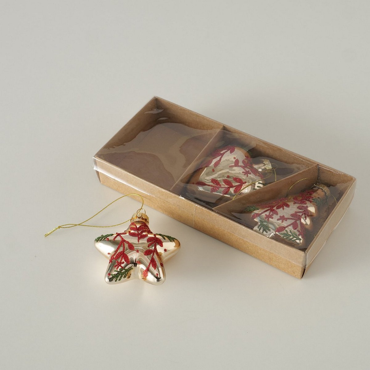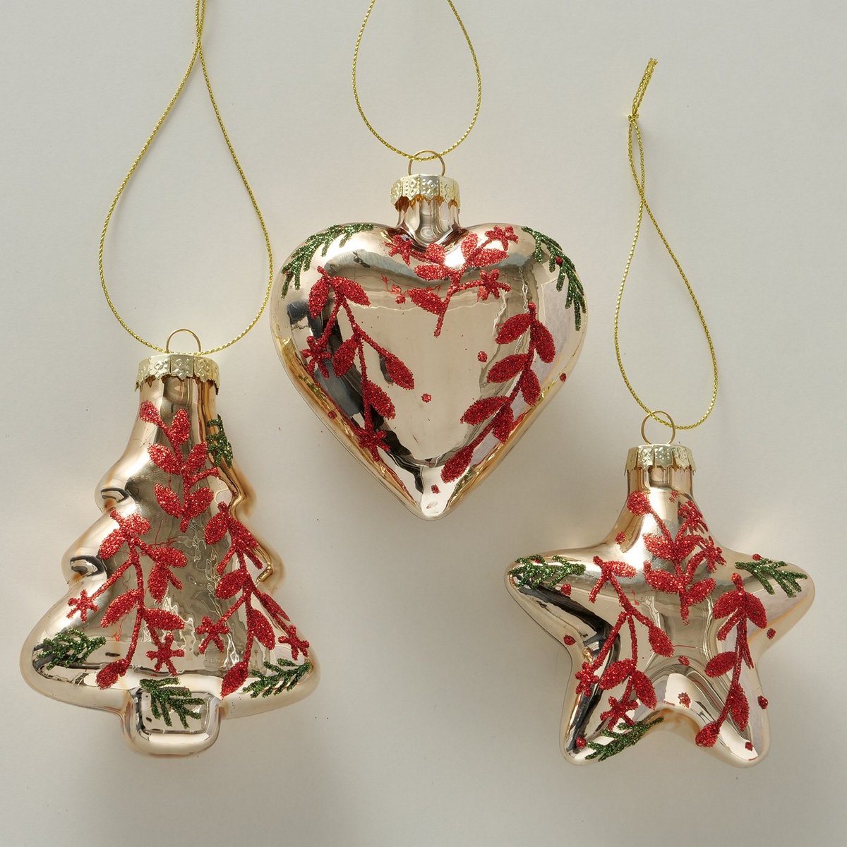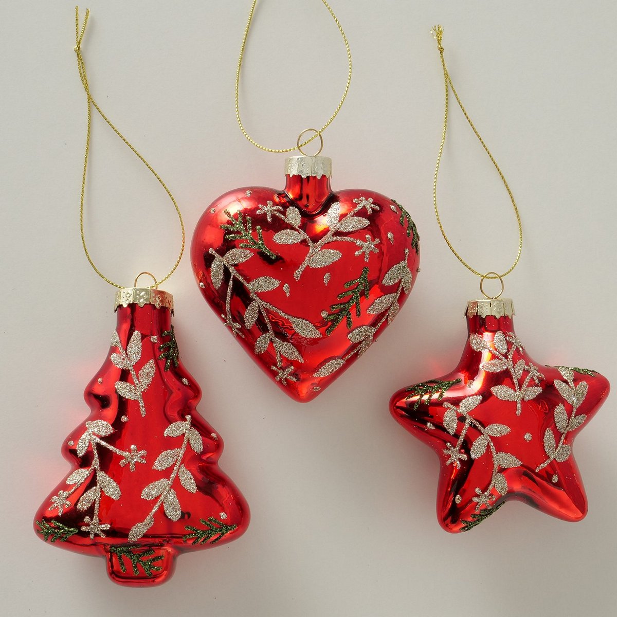 Christmas pendant Wieke, 3 p., 2 ass., Heart, Tree, Star, L 7,00 cm, H 8,00 cm, Glitter, Shiny glass laquered colour-mix