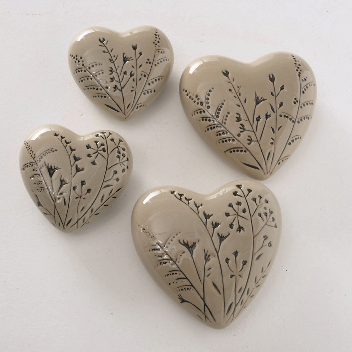 Decorative object Botanico, 2 p., 2 ass., Set 2, Heart, H 4,00 cm, Porcelain, Floral porcelain taupe