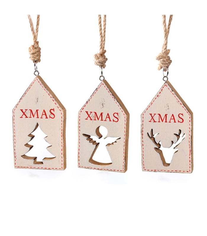 ORNAMENT ASS/3 WOODEN TREE/ANGEL /REINDEER WISHES XMAS RED LETTERS