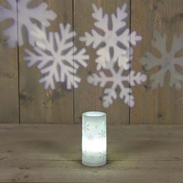 B.O. WHITE CANDLE WITH GLITTER SNOWFLAKE 7X15CM LED WHITE SNOWFLAKE PROJECTION 3XAAA AND INCLUDING 1M USB CABLE