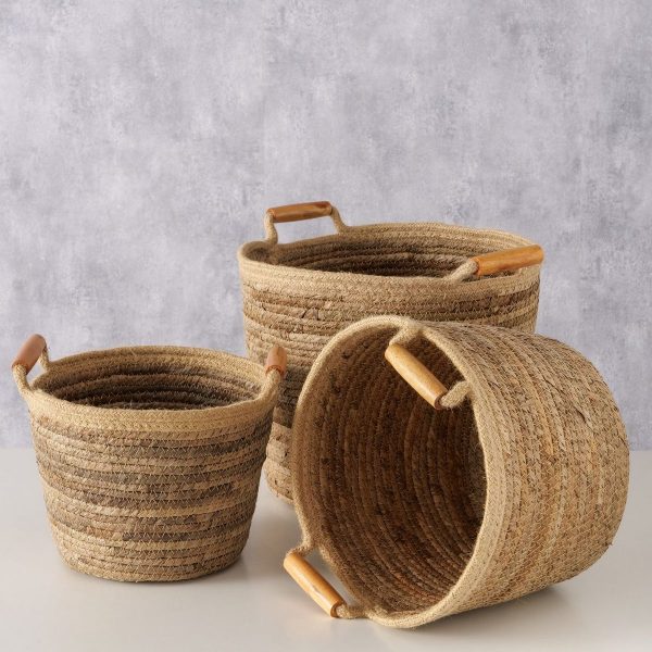 Basket Elowen, 3 p., Set 3, Round, H 17,50-26,00 cm, D 23,50-29,00 cm, Recycled wood, Cotton, Banana leaf