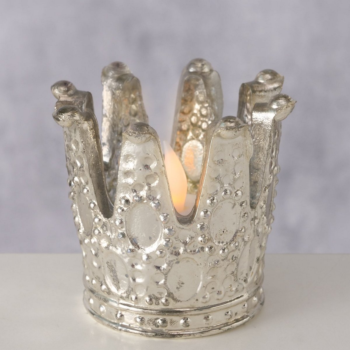 Tealight holder Crown, Crown, H 7,5 cm, Glass lacquered, Single-colour glass laquered silver