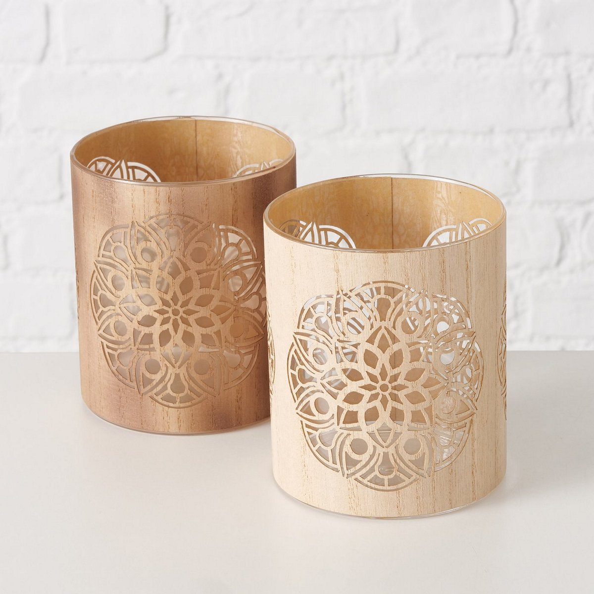 Windlight Chakra, 2 ass., Round, D10 H12 cm, Foxglove tree (Paulownia tomentosa), Clear glass, Single-colour mixed material