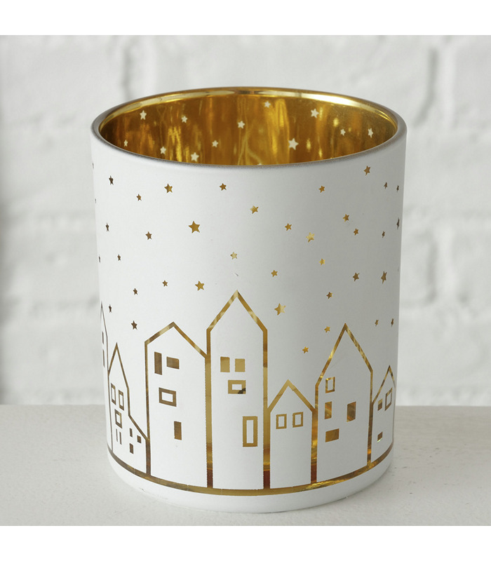 Windlight Little Town, 2 p., 2 ass., Set 2, Round, H 8,00-10,00 cm, Glass laquered, All-round printing glass laquered co