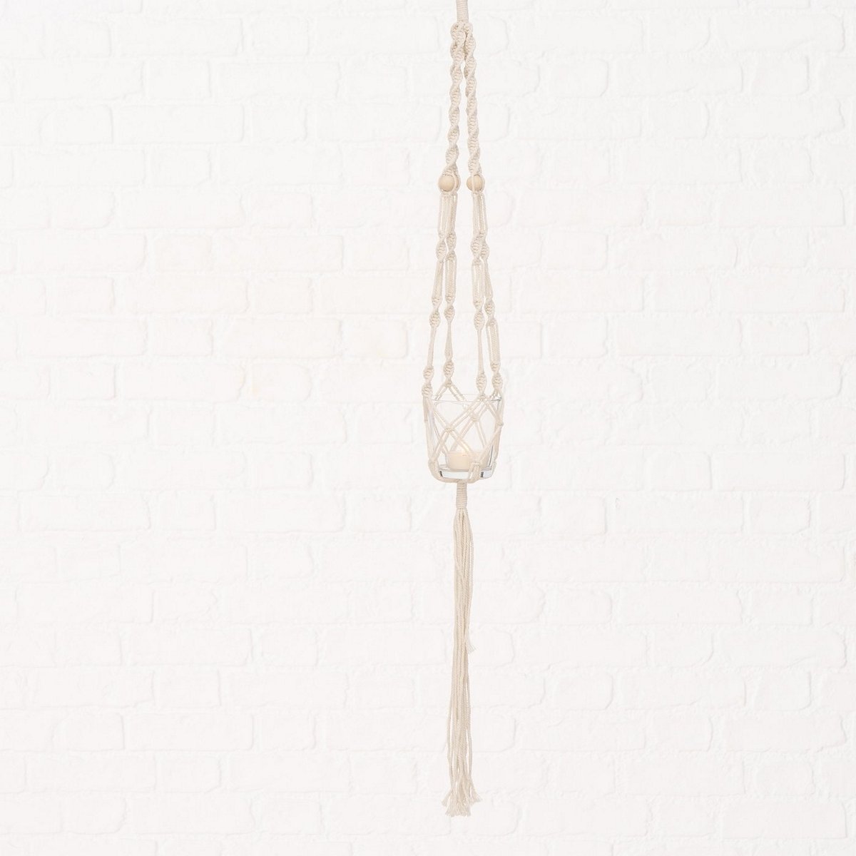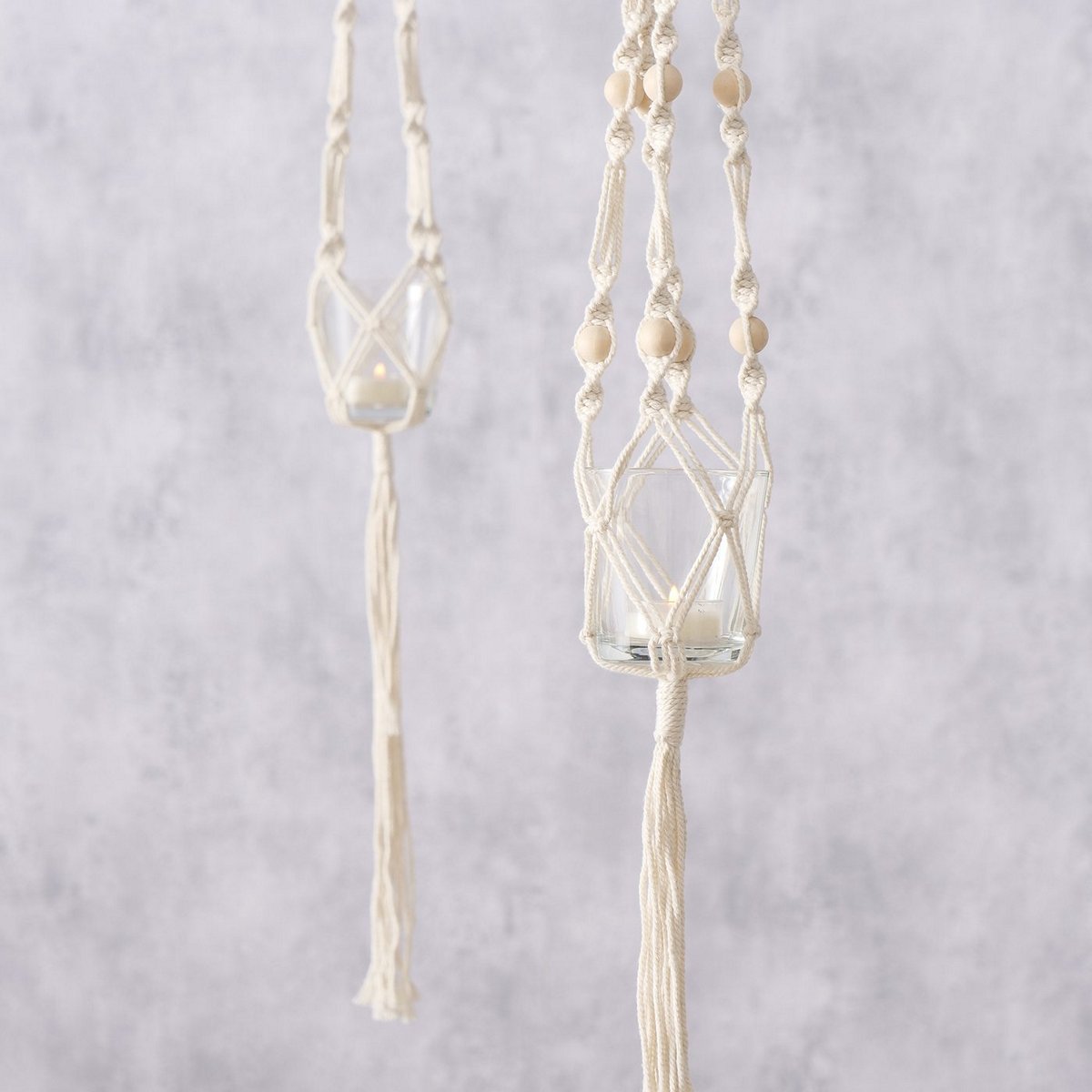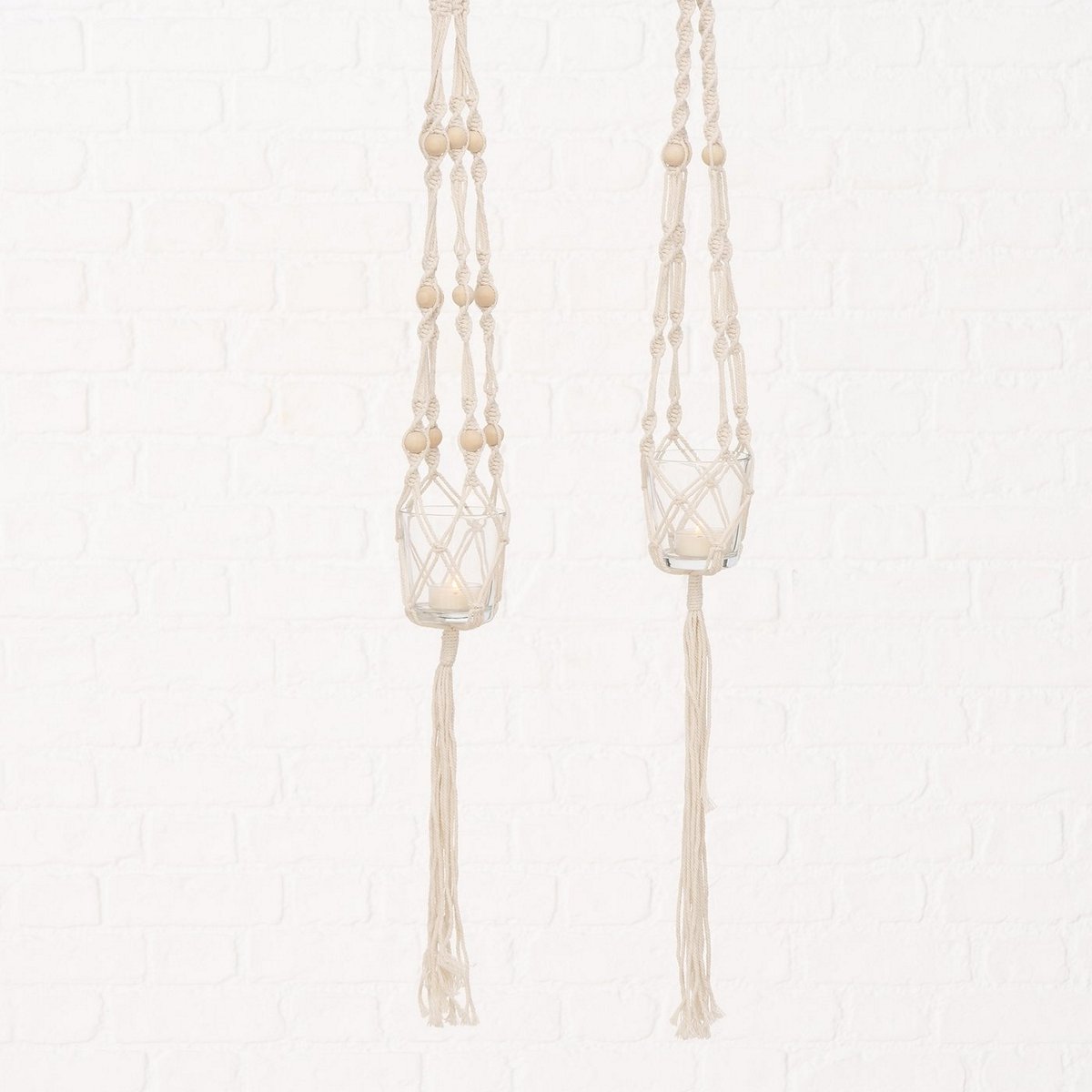 Windlight Makramee, 2 ass., Round, Schima (Theaceae), Clear glass, Cotton, Single-colour, Transparent, White mixed mater