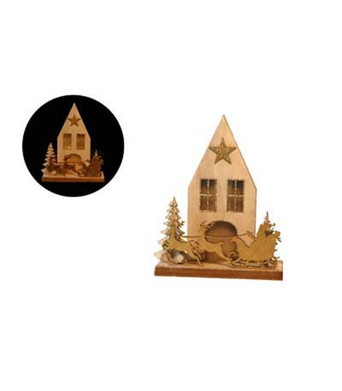 Wooden house w.deco on base w. LED natural/gold 26.5×25.5×9