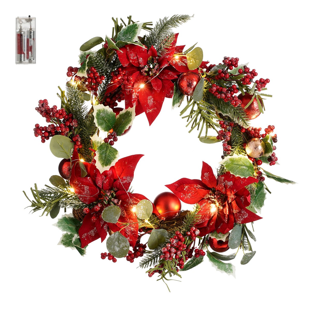 Wreath poinsettia red frosted 20 led battery operated – h10xd55cm